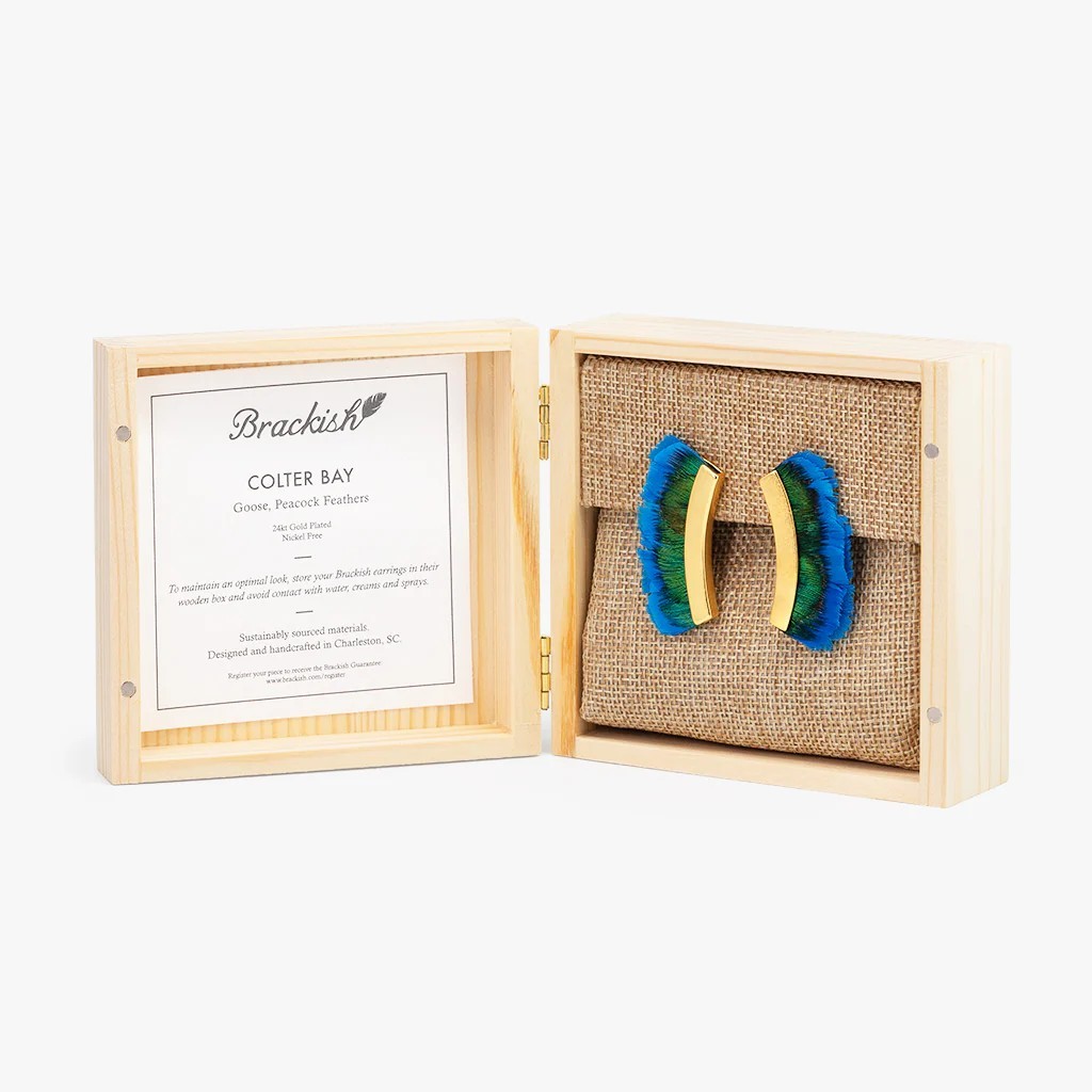 The Colter Bay Gold Crescent Earring is sure to be a show stopping statement piece. The textured scalloped edging of these blue and green earrings breathes movement into goose and peacock feathers. Handcrafted with a hint of iridescence to mimic the rolling waterways of Wyoming. 24k gold plated stud with straight posts and push back closures. Hardware is nickel-free and lead-free making it suitable for sensitive ears. Earring dimensions are 2.5” long and 1.25″ wide. Each feather used in production is all-natural and sustainably sourced. Each earring is designed hand-crafted in Charleston, South Carolina.