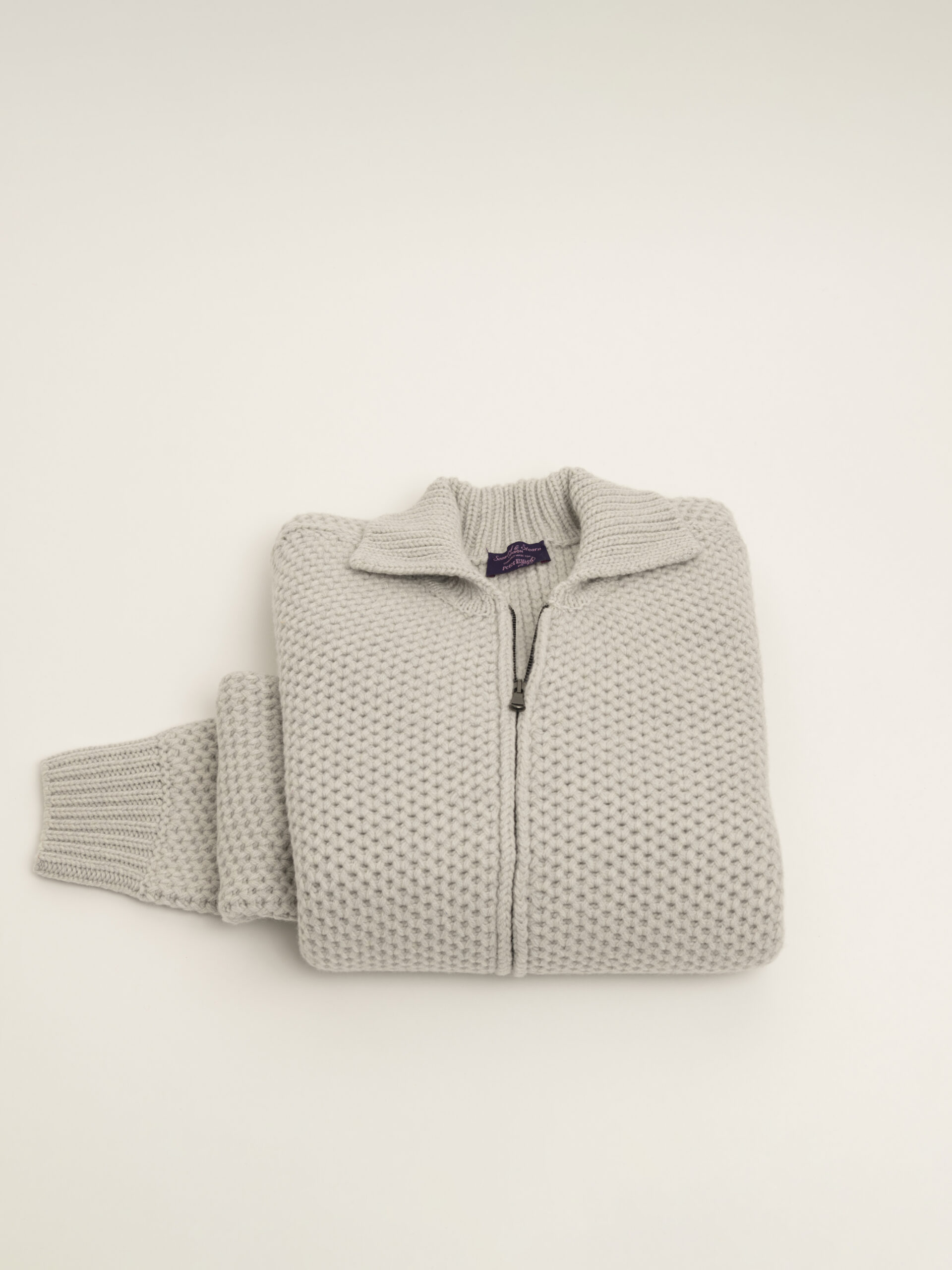 Made in England from 100% wool, this popcorn knit full-zip cardigan offers both warmth and versatility.